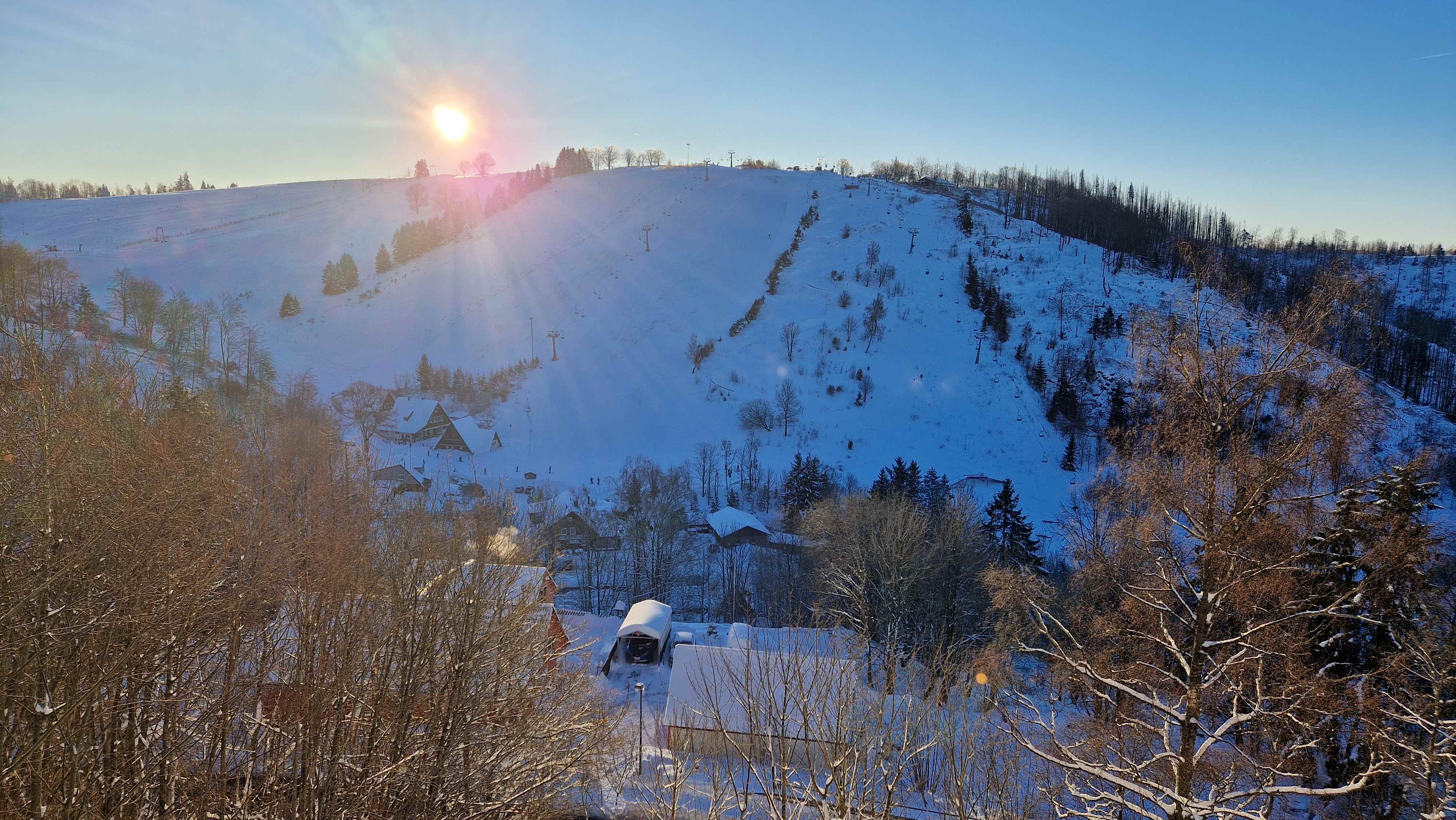 Ein 1,5-Zimmer-Wohnung mit Balkon, Küche und Badezimmer mit Badewanne. Herrlicher Blick auf die Skipiste im Winter und die Rodelbahn im Sommer.